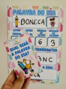 O material contém: -Cartaz dividido em quatro folhas A4; -100 cards com imagens ilustrativas; -Caixinha.